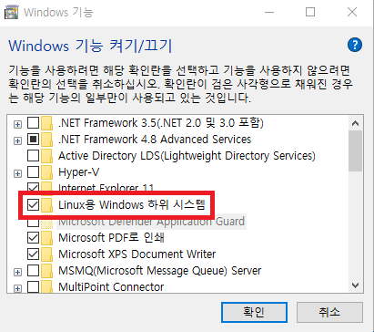 작업표시줄에 윈도우에서 windows 기능 켜기/끄기에 들어가 Linux용 하위시스템을 활성화 해주세요