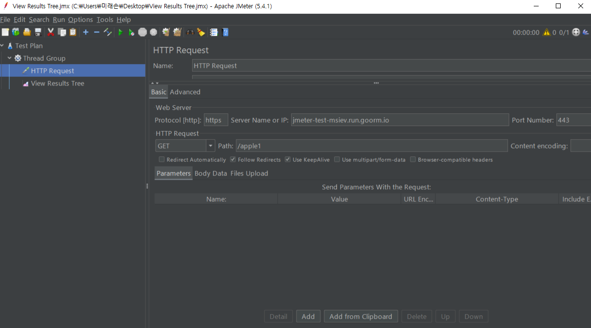 Thread Group, HTTP Request Sampler를 만들어줍니다.