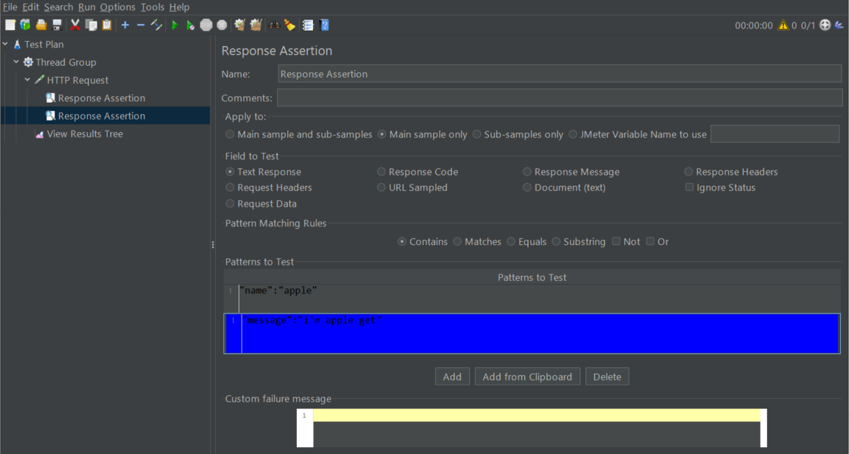 HTTP Request를 오른쪽 마우스로 클릭하고 Add -> Assertions -> Response Assertion을 클릭해줍니다.