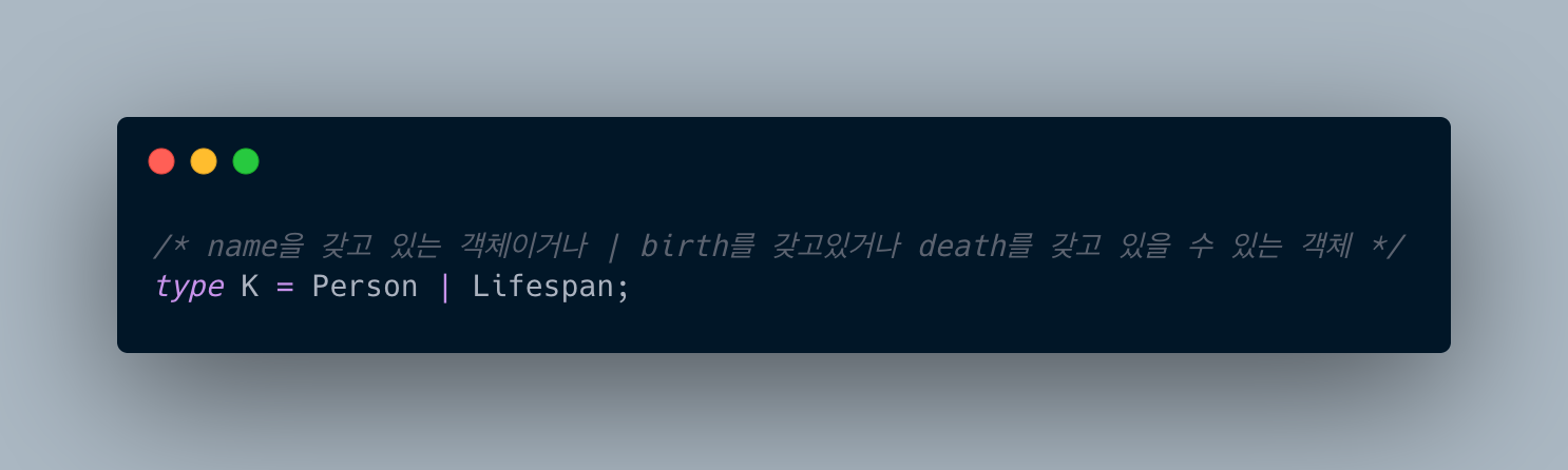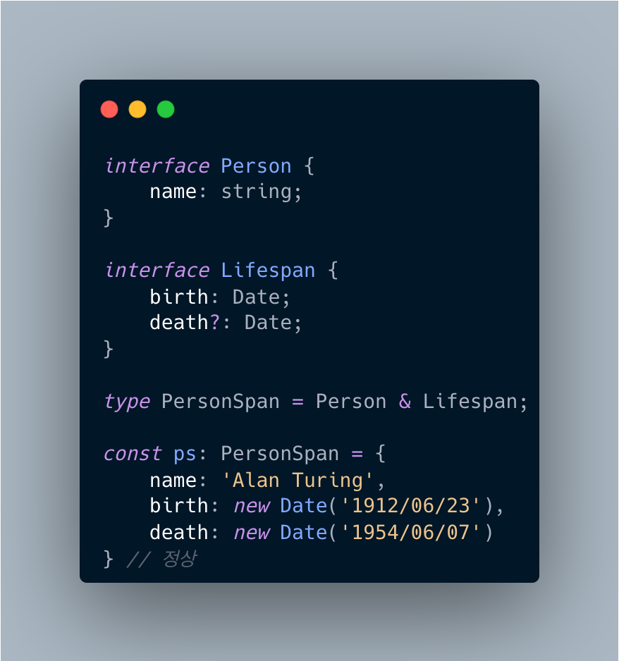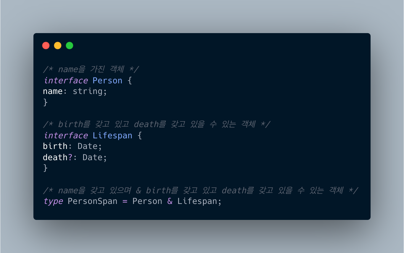 처음 코드를 보았을 때 Person은 name을 갖고 있고 Lifespan은 birth와 death 프로퍼티를 갖고 있기 때문에 교집합이 없어서 never(공집합)이라고 생각했습니다.