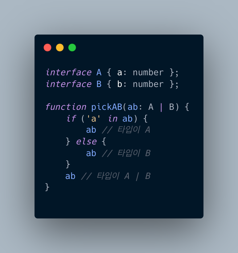 프로퍼티가 존재하는지 확인할 수 있는 in 연산자를 통해 타입을 좁힐 수 있습니다.