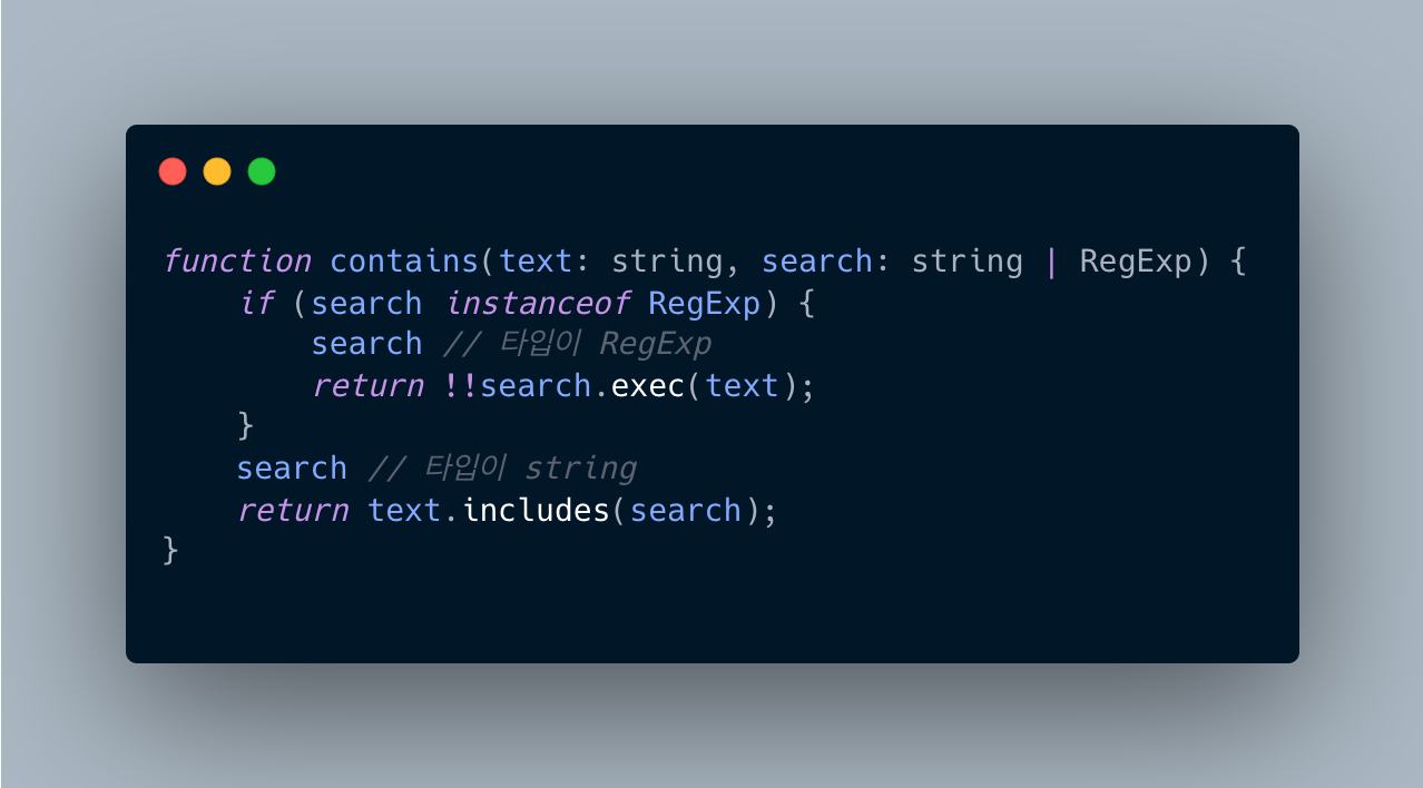 생성자의 프로토타입 속성이 객체 프로토타입 체인 어딘가에 존재하는 여부를 확인할 수 있는 instanceof 연산자를 if문과 사용해서 타입을 좁힐 수 있습니다.