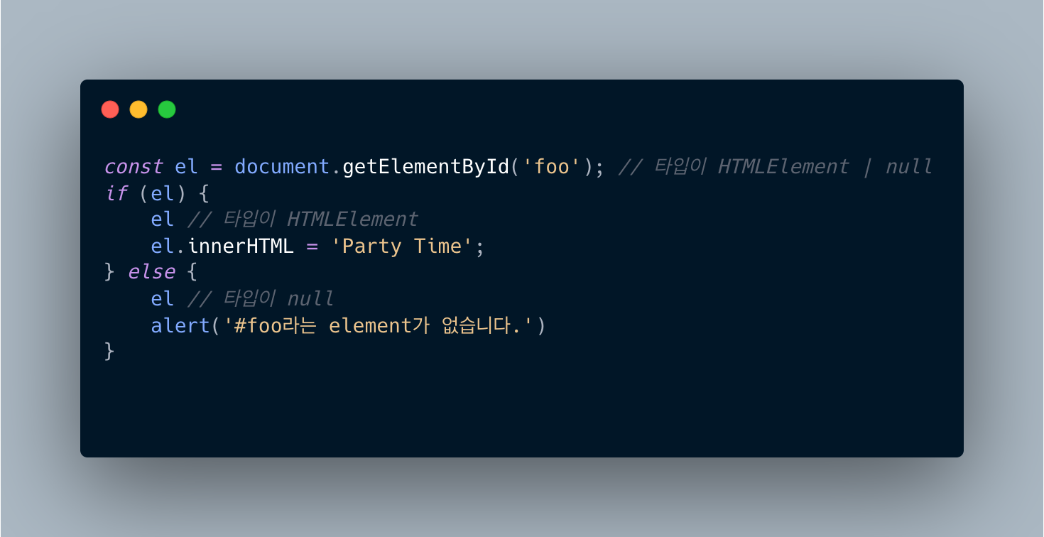 존재하지 않을 때 null을 반환하는 메소드나 함수의 경우 if 문을 통한 null 체크를 통해 타입 좁히기를 할 수 있습니다.