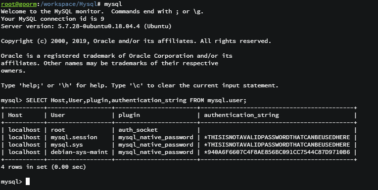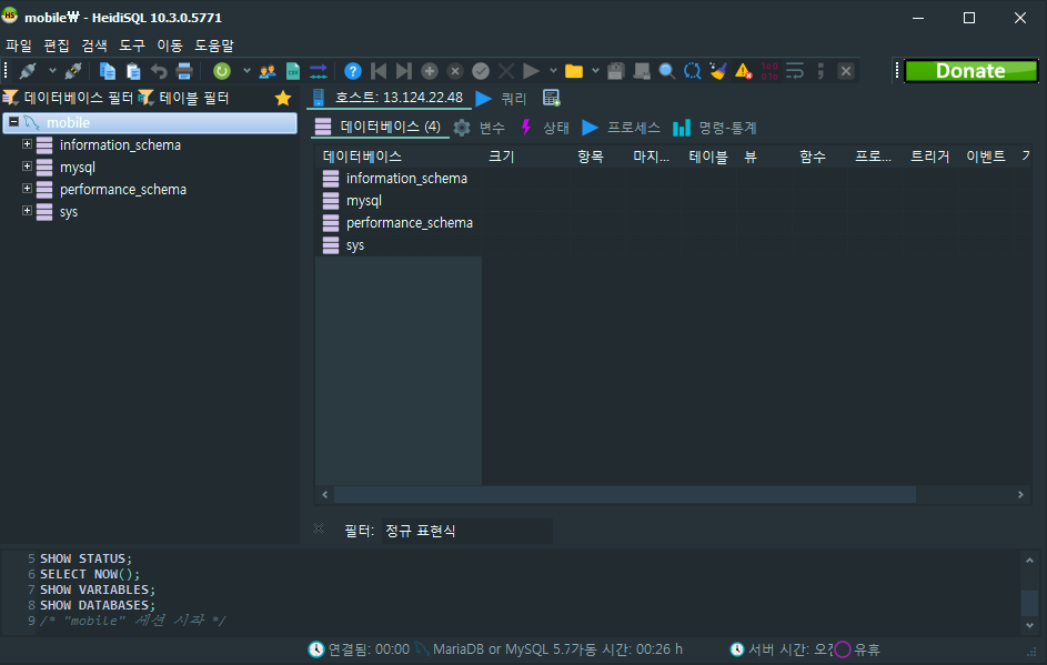 그리고 mysql에 접속해 현재 부여된 권한을 확인해줍니다.